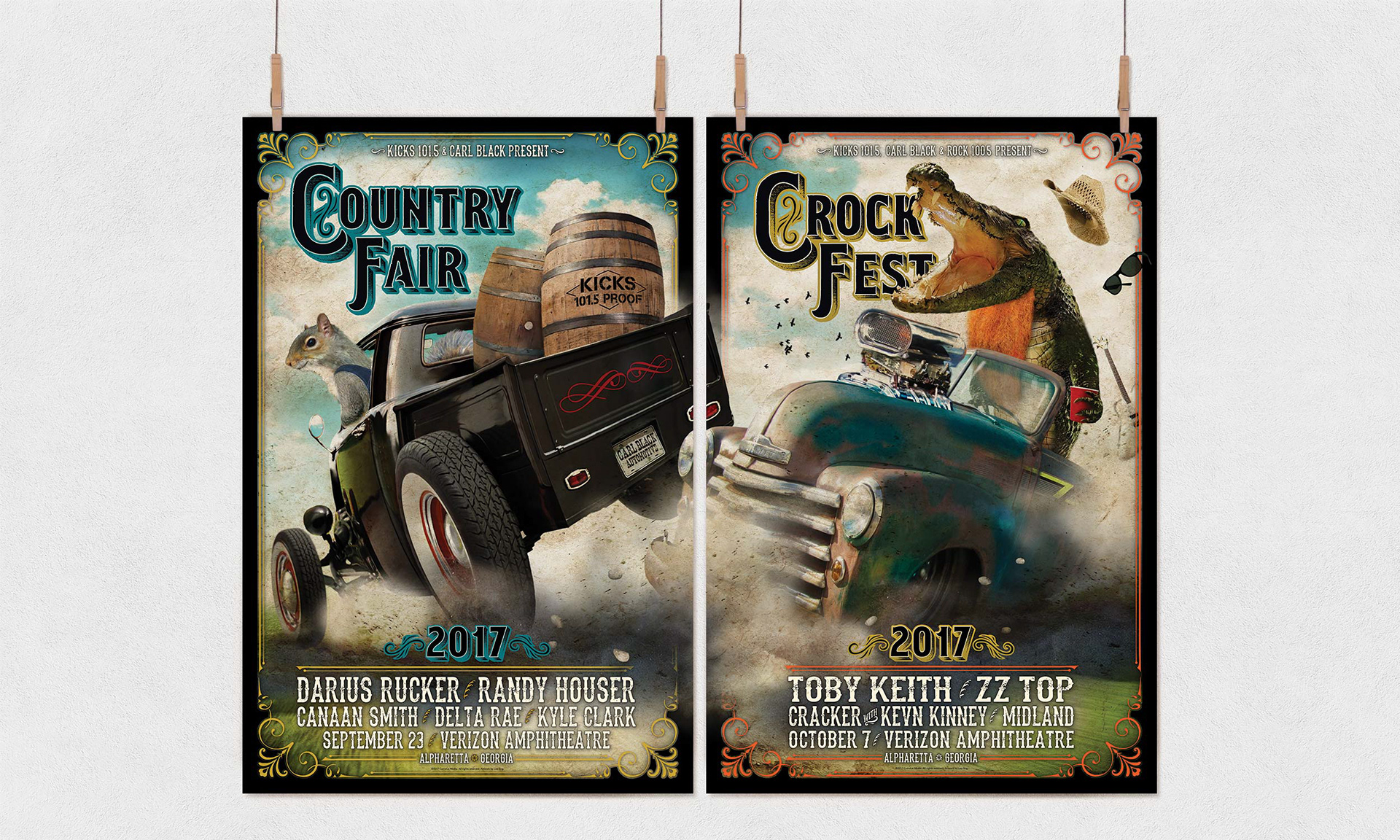 Description: Posters for two separate music festivals. Posters intended for display side-by-side to form a continuous narrative. Event titles: Country Fair 2017 and CrockFest 2017 Client: Cumulus Media